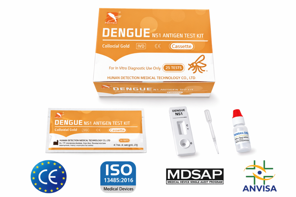 O Kit de Teste de Antígeno Dengue NS1 é um imunoensaio cromatográfico rápido para a detecção qualitativa do antígeno NS1 do vírus da dengue em sangue total, soro ou plasma humano.