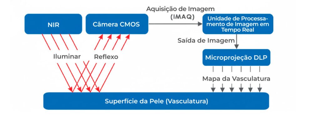 O dispositivo utiliza o princípio de absorção da luz infravermelha pela hemoglobina no sangue. Ao ser posicionado sobre a pele, as veias, ricas em hemoglobina, absorvem a luz infravermelha próxima e aparecem visivelmente distintas do tecido circundante. Isso permite uma visualização clara da vasculatura na superfície da pele, facilitando significativamente a localização da veia para coleta de sangue ou administração de medicamentos. O contraste visual entre as veias e o tecido circundante torna o procedimento mais preciso e eficiente. A tecnologia de imagem em tempo real do VV-100 oferece aos profissionais de saúde uma ferramenta confiável para identificar veias adequadas, evitando tentativas múltiplas e reduzindo o desconforto do paciente durante procedimentos de venopunção.